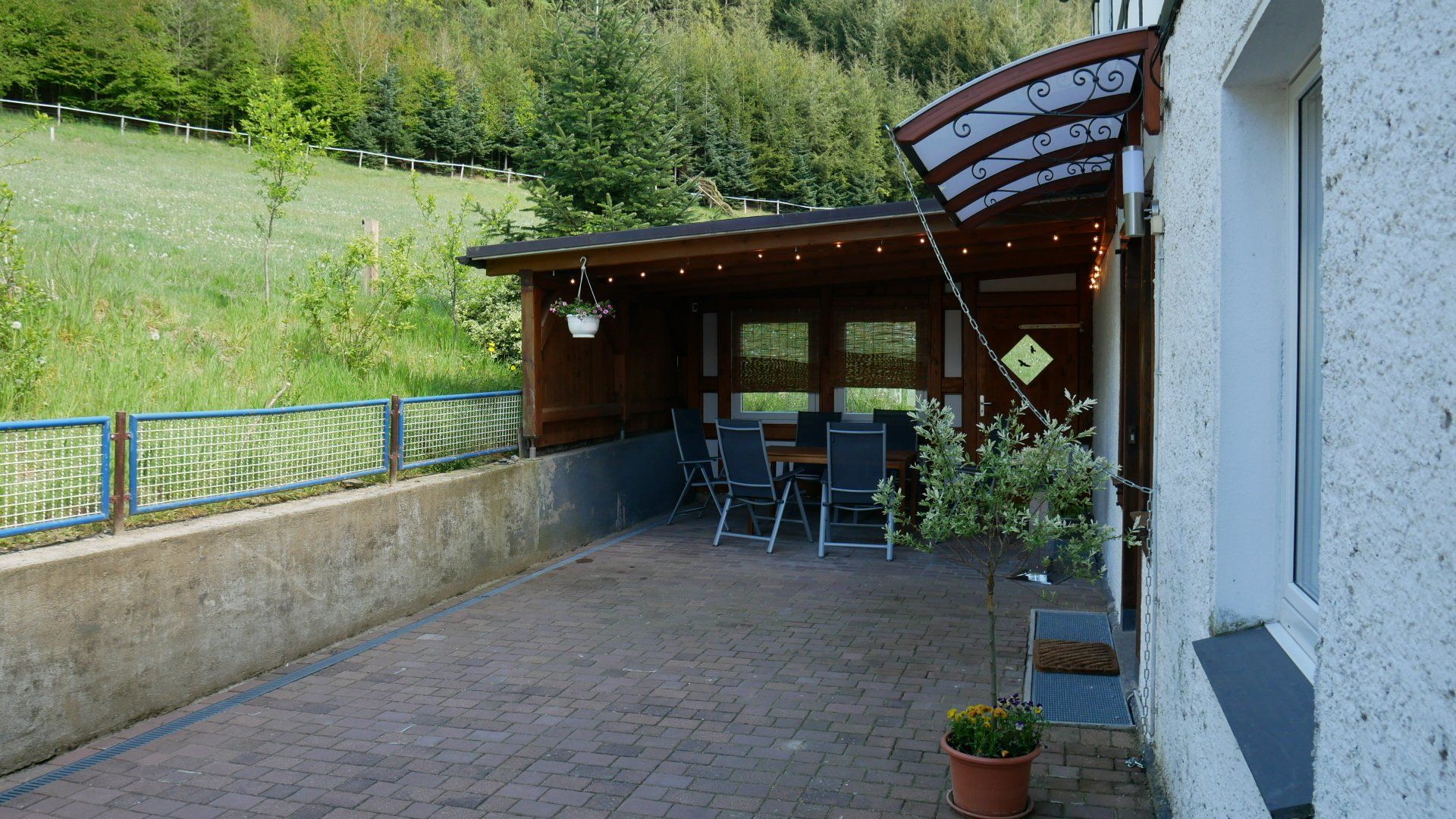 Direkt am Eingang zur Ferienwohnung befindet sich ein überdachter Teil (Carport), der in wärmeren Monaten als Sitzecke dient und mit Gartenmöbeln und Grill ausgestattet ist. In den Wintermonaten finden die Feriengäste dort nur auf Wunsch Sitzgelegenheiten.